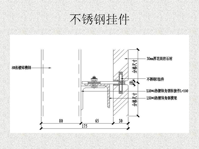 干挂石材是建筑外墙的一种施工工艺,该工艺是利用耐腐蚀的螺栓和耐腐蚀的柔性连接件,将大理石、花岗石,人造大理石等饰面石材直接挂在建筑结构的外表面,石材与结构之间留出 40~50mm 的空腔。用此工艺做成的饰面,在风力和地震力的作用下允许产生适量的变位,以吸收部分风力和地震力,而不致出现裂纹和脱落。当风力地震力消失后,石材也随结构而复位。