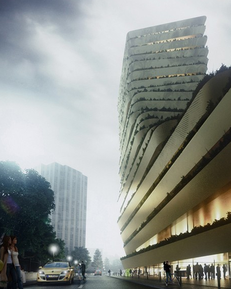 位于斯洛文尼亚采列古城中心,废弃的场地并非直接相邻历史建筑,但有一个相当复杂的高海拔小面积的周围环境。设计师希望给这片区域创建一个逻辑,使各种类型建筑组合在一起。该建筑由一系列堆叠的层面或推或拉地叠放在一起,好像是在对周围的现有空间做出回应。塔分为三个大层,低水平在南面反映出高度的独立住宅的,在底层形成一个活跃的临街公共设施,和街区一起形成了一个新的开放广场。西部逐渐向上升起,变成一系列的阳台,最终到达周边建筑的高度。建筑正面展开朝向相邻的大公园,有良好的观景角度。水平梯田线的外观结构模糊了划分部分之间的转换。设计特别注意帮助集成现有的人行道,引导行人到市中心、广场和径 savinja河。一条绿带也沿着建筑边缘,形成了一个历史去的框架。