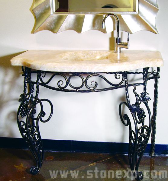 此组洗脸池是由天然石材的面盆和艺术的铁架相结合而成,石材与其它材料的完美结合打造出别致、艺术的效果,令人神往