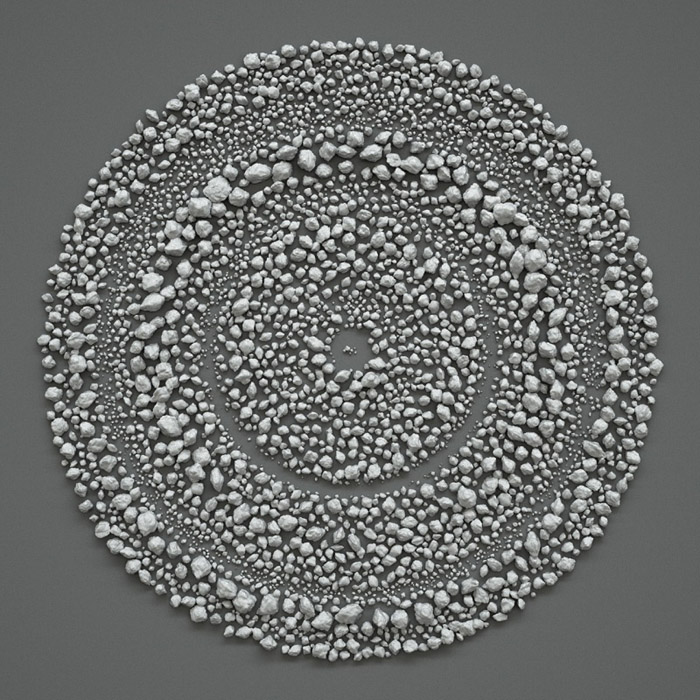 艺术家Giuseppe Randazzo利用算法生成演变型三维对象,而后再对其进行渲染得成的作品。结果是迷人的,富有静谧感的石头景观。通过这种艺术手段和方式得到一个具有极大反差的富有永恒感的作品,这有些讽刺意味。或许这是一种“偷懒”的方式,创作排列这些虚拟的石材,并赋予精神的力量,同时在此过程中出现了与大地景观的一种联系,从开始无序的“自然”碎片(真正岩石/虚拟岩石)影响(作者/软件)到你的环境(真实/位图),这也许已变成真正自然。