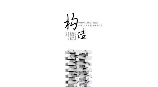 设计说明:这是一款大理石制作的灯具产品。设计最初的灵感是来自立体构成,利用石头的重量,将大理石切成长条型或块型,这样一来,人们可以发挥自己的创造力搭建自己的“建筑”——三维造型。我们的眼睛是通过光才看见世间万物,物体的造型也是在光的照射下才得以体现,所以我们为该产品设计了一个可以摆放不同角度的光源。为了实现不同角度的摆放,我们想到了多面体,通过不同的面作为底面,光源实现了不同角度的照射,在光源的照射下,有长条型或块型搭建的“建筑”显得雄伟壮观,精美绝伦。