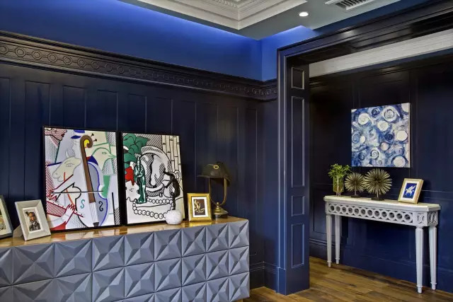 一进门你会被浓浓的艺术氛围所吸引,门厅背景墙上男士外型模样的抽象派饰物就奠定了这个房间的格调,时尚感极强,搭配护墙板的灰色很是默契,与之应景的是白色的门套与线条,相互穿插谁也抢不了谁的风头,包容又足以眼前一亮。精美的门扉,将原本平淡的墙体无限的拉向远方,仿佛既在门里又在门外。