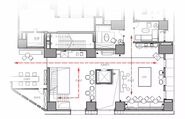 在功能组织上,我们希望不重复以往强烈的销售主题做法,而是希望能冲淡买卖的痕迹,让顾客随兜转的动线,漫步上下两层,充分体验整个空间,并在驻停、参观、洽谈的轻松氛围里自然的完成销售行为。