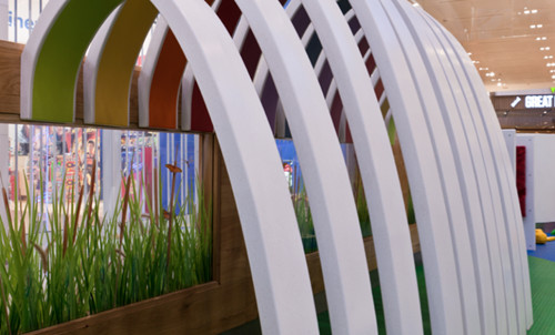 人造石安全环保、无毒无辐射特别适合于儿童游乐场所。坐落在儿童商场的儿童乐园,纯白干净的外墙和多彩的彩虹桥,很能吸引小朋友的目光,自然也吸引了许多客流量。