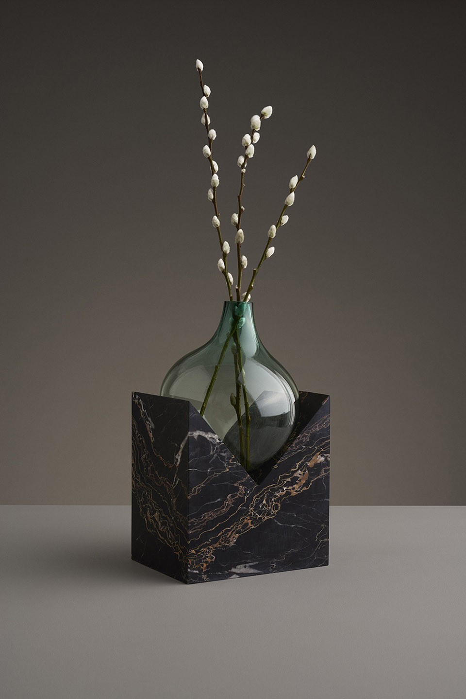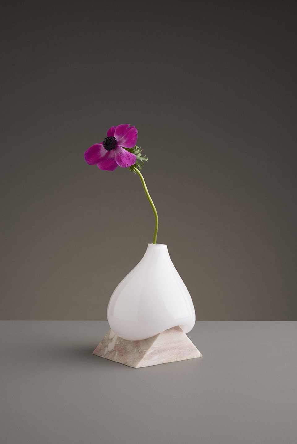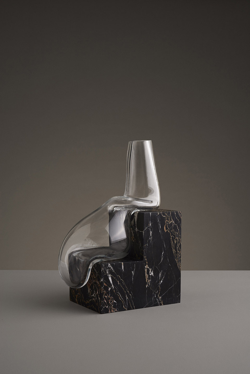 刚与柔、虚与实、脆弱与坚硬在这个花瓶系列上得到了完美的诠释,几何图形的大理石坚实利落,置于其上的玻璃瓶身曼妙多姿,无论花朵有否,都令人赏心悦目。