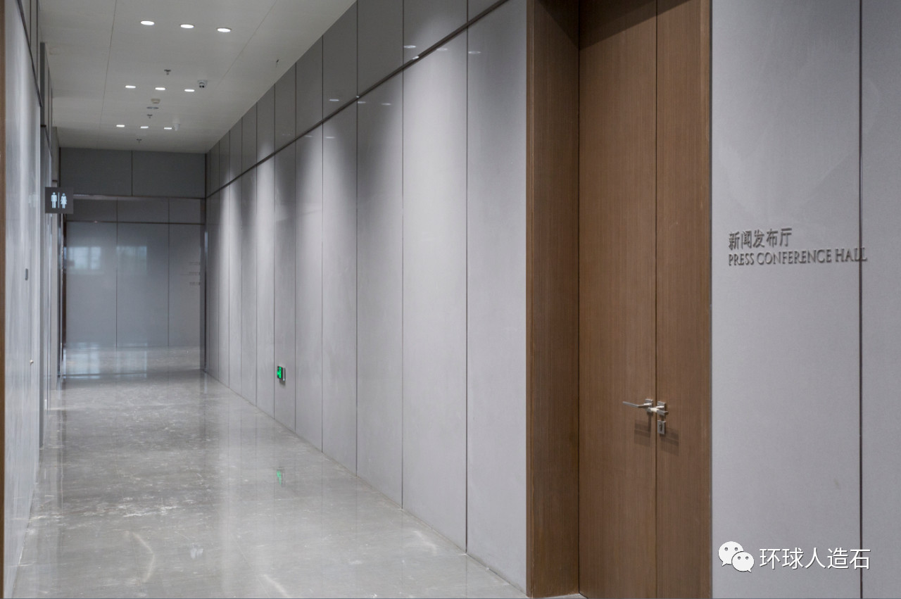 大型公共建筑往往十分注重装饰的整体性,本项目主打现代简约的设计风格,同时融合中式古典美学,打造一个地标性公共艺术平台。我司有幸承接了该项目的石材供应,主要供货产品为GY214米兰灰(无机人造石)超大板材,主要规格为3000×1200×20mm,采用稳固的背栓干挂系统,衔接部分镶嵌玫金色不锈钢装饰线条,应用面积约12000平米。产品的最终装饰效果和服务质量,得到了甲方、设计方的一致认可。