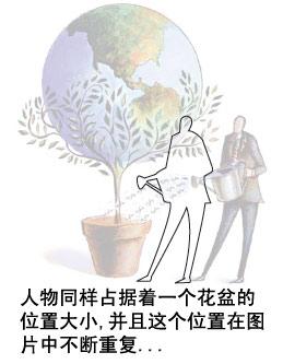 首先考虑的是图形,到底应该把它放在哪儿,占多大的地方,这里关键是考虑视觉联系。图中的地球和花盆有很强的对称关系,所以放在页面正中央是最合适的,页面中心是最能强化它们关系的位置。