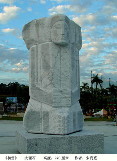 杨金环完成的作品《男人的眼睛》长380cm,石材产自台湾的南部花莲地区,属于大理石表层岩,呈黄色。由于作者需要自然形态的石材,所以运到现场的这块石头很大,长度都快到400cm了。应该说杨金环的这件作品最难的是挖两个三角形大洞。幸运的是,义守大学主办方提供机器钻孔,还为他省点事。据他讲,他的这块石头,看示较软,其实不太好刻,有的部位还是挺硬的。“眼睛”的瞳仁位置是一卷曲的浮雕女人体。该作品除了作者想表达的男女两性关系引申的文字和文学意义外,作品材料有相当厚度所呈现的厚重的形体感是一次意外的收获,因为作者设计厚度是70—80cm,而得到的这块石头足有120cm厚。作者在雕刻中干脆利落的勾勒了眼睛的外形,又深入细致地刻画了女人体,对比鲜明,整个效果显得生猛,又可细看。