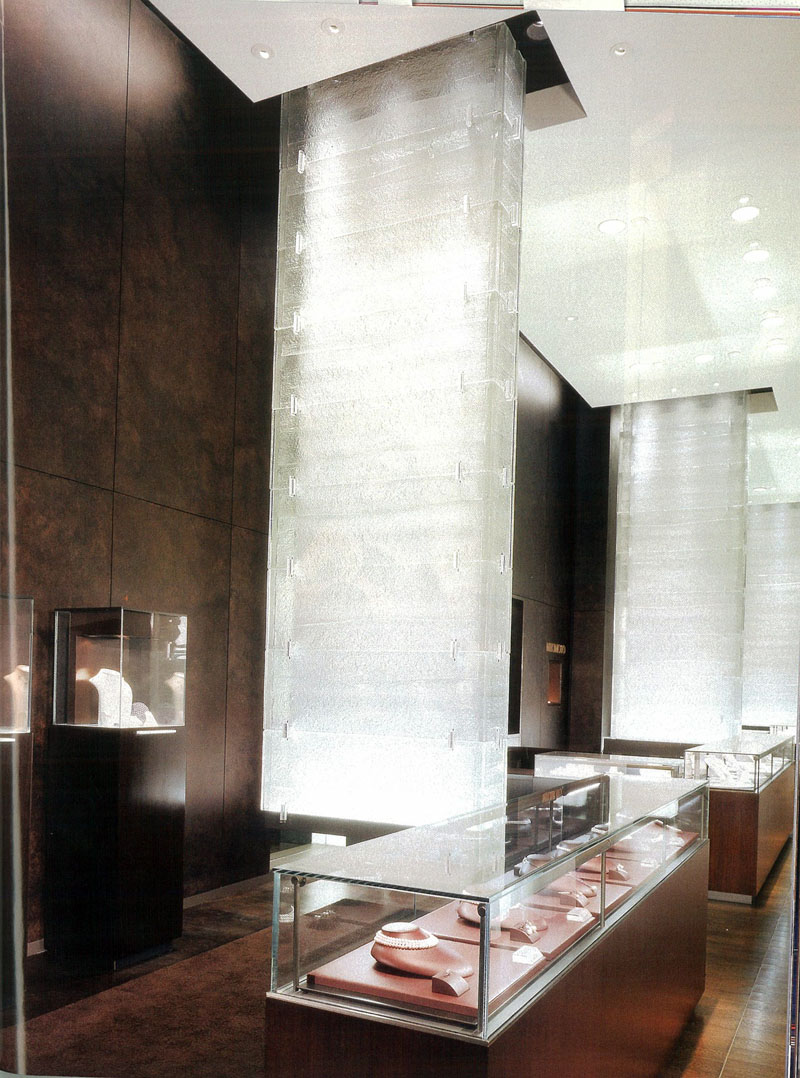 墙面:1夹丝玻璃(画面看到的木材其实是两片玻璃中间夹着一张木皮,所以反射会很强烈,隔断用的玻璃里面夹的是麦梗,五颜六色则是夹着各种颜色的丝绸.)