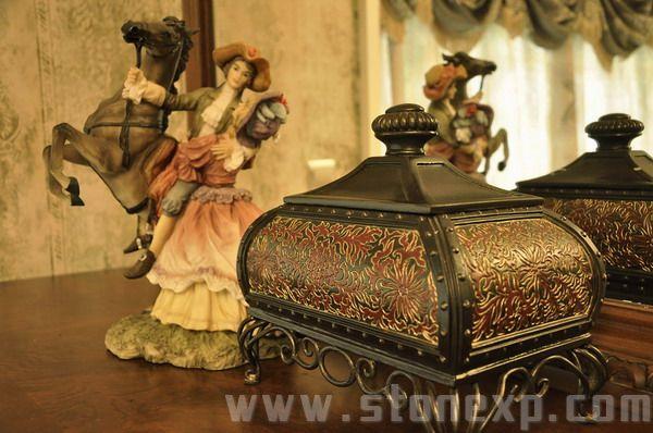 客厅空间形式简洁流畅,主立面的米色石材背景与粟色家具烘托典雅色调,简化的券拱结构划着优雅的弧线,把客厅、餐厅稍做视觉上的分隔,而丝质纱帘又柔和的拉近了两者的距离,沙发背后陈列的工艺品活泼、华丽,衬托着空间的品位。稍带银光的墙纸与石材一起是整面视觉的核心所在。铁艺做旧处理的灯饰有些斑驳,营造了空间的历史感。沿着精致的木梯而上,前厅周围均匀分布着主人房、孩子房、老人房、书房等功能空间,都保留着别墅特有的坡顶结构,卧室内用墙纸高贵的色调来衬托主人的气质,新古典的大气的樱桃木床彰显了主人的品位,蜡烛般的灯光开启,如烛光摇曳,浪漫情怀尽显其中。荡漾着人文,艺术,关键是典雅的生活。