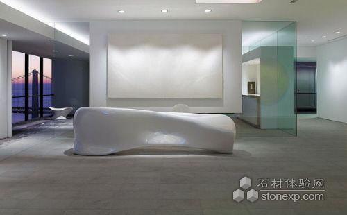 白色的接待区域是极简单派艺术的典范。亮光白色的生物体形状接待台很可能被误认为是扎哈·哈迪德(Zaha Hadid)的作品,配套座凳沿玻璃墙摆放。另一侧地板上摆放的长条形操作台,将整个办公室的用途表现出来:旧金山“阿尔蒂斯”资本管理公司(Artis Capital Management)。