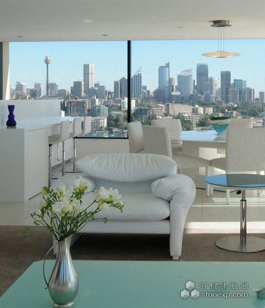 设计师Keith Pike Associates对于这40年建筑的第十四层进行了重新的改造和装饰。改造的内容包括窗户的修改,室内的布局,以及家具的颜色与海景的搭配等。室内整体颜色为白色,所以设计师选用了天然石材雪花白作为餐桌台面,浴室墙面与浴缸前的台阶同样采用天然石材雪花白,体现了现代家具装饰的简洁。