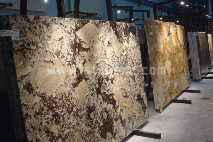 展厅展出的大板主要材质为石英岩,其硬度有的甚至能与钻石相媲美,颜色纹路变幻无穷,给装修者无限的想象空间,并且很多颜色是石材行业中极其罕见色,开采的矿山也极其有限,如有着湖水蓝的“海冰蓝”,每个人看都有不同畅想的“蓝星云”等。