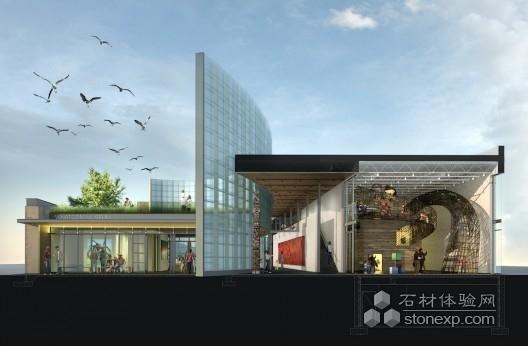 设计师为地区博物馆设计的则是半环形结构,它环绕一片空地,形成一个露天广场,与两个塔形成鲜明对比。设计师打算让这个广场充满光,因为在西北部光是稀缺的。设计理念便是建造一个能捕捉光的弯面墙。