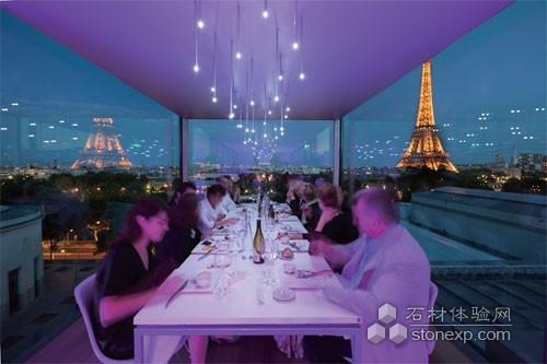 餐厅拥有一体化的大型操作台,集合了盥洗、烹饪、就餐三个主要功能于一身。它拥有独特的使用功能和良好的视觉效果,纵向展开,迎合了整体条形的建筑空间。而这个“长桌子”同样可以抽象看成一条活跃的线,纵情的划出自由装饰的语言。由此,空间几何语言就被积极地组织起来,所有的元素都围绕着它,在此过渡展开。站在内部空间放眼望去,玻璃盒子外一片美丽景致,著名的塞纳河与艾弗尔铁塔尽入眼帘,无论白天与夜晚,景致随着色彩的改变,给餐厅内部的人们带来了不同的心情,白天豁然开朗,神清气爽;夜间神秘冥静,深邃幽然,还有什么比这天然的景致更适合作为装饰元素?