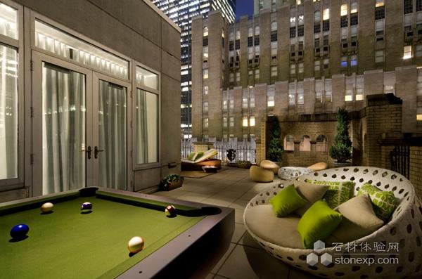 田园诗般的童年树屋,融入了时尚、成熟的元素,床是包裹在异国情调的斑马木中,成为了客房的重点。浓重的咖啡色木材和生动的木纹理图案使这个房间的格调处在一种被温暖包裹的情景之中,给人一种轻松的氛围,去感受或是回忆。特别订制的床头采用了背光灯,并巧妙展现抽象的影像,像是起伏不断的丘陵或是优美曲线的人体。顶面刷上了华丽的紫红色,盖在温暖的帐篷床顶上,温馨舒适。
