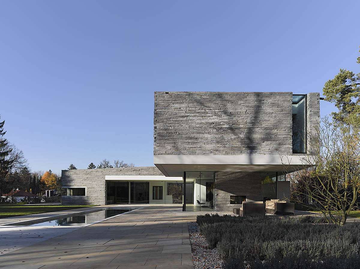 这幢时尚、现代的住宅由德国建筑师Titus Bernhard 设计建造。房子的显著特点在于北面穿越了一两层高的斜坡,最终与花园的地面持平。而且整幢房屋的外墙全部采用表面粗糙的石材打造。