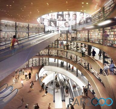 设计者Mecanoo事务所公布的两张图片显示了在世纪广场上建造的新的户外剧场以及图书馆内中央圆形大厅的雏形。