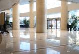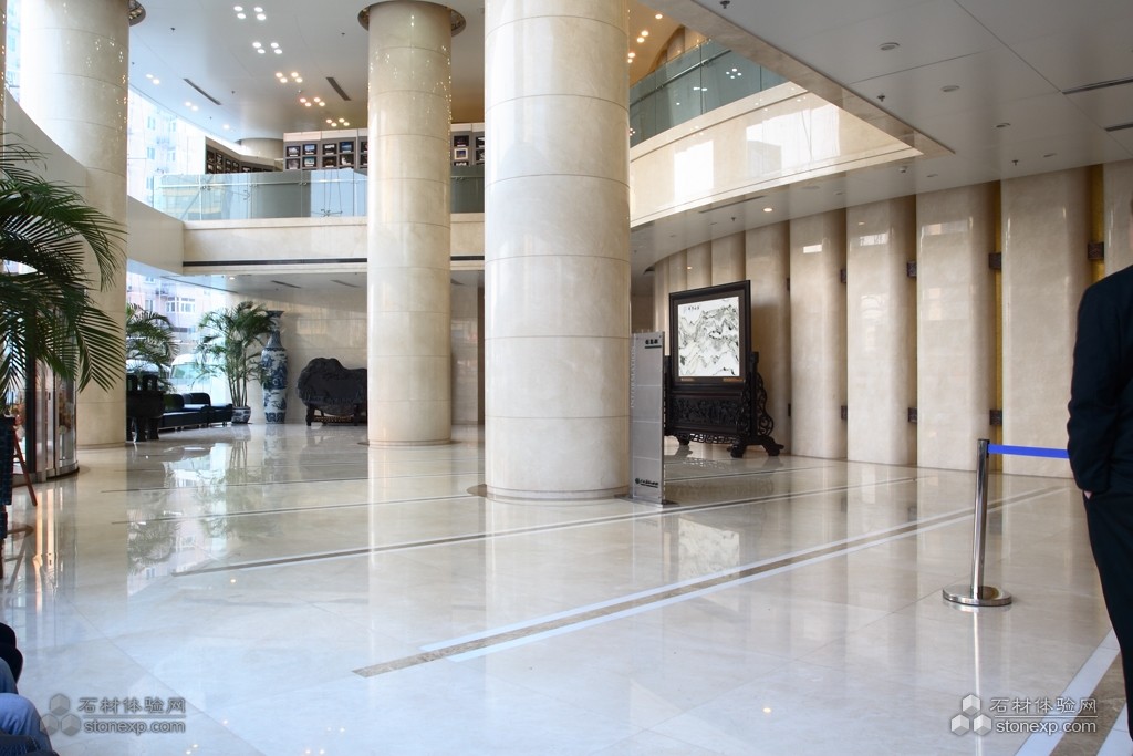 长安兴融中心使用天然石材,给人以大气,简约,明快的视觉享受。大厅使用了木纹石(一种天然大理石)做墙面和方型大柱,与地面的白色交相辉映。