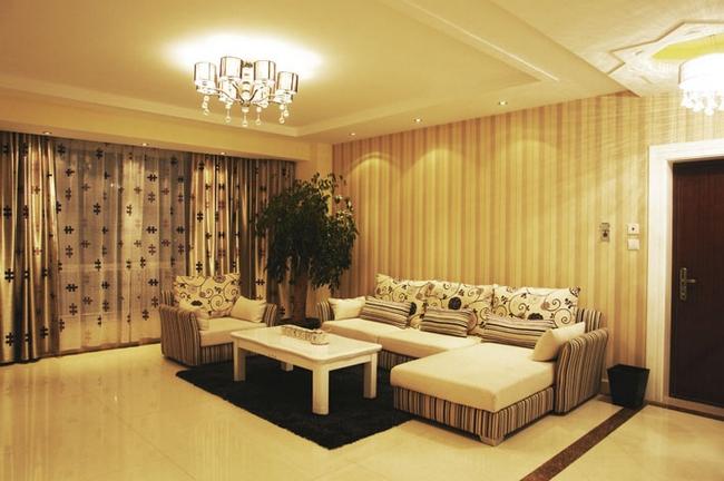 电视墙面作为整个房间的视觉中心,采用了咖金色的金属拉丝马赛克,沉稳凝练的方正格局,一扫空间的苍白。沙发背景墙采用比电视墙浅一度的竖条纹壁纸,起到了前后呼应的效果,同时让原本略显低矮的客厅,得到了视觉上的增高。而沙发选择了简欧式条文与卷纹搭配的布衣沙发,给人以素雅中散发韵律的艺术享受。