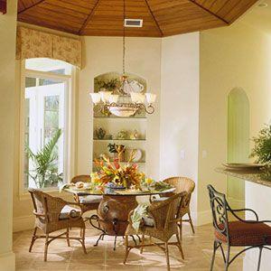 很多人都曾为家里的不规则空间发过愁。而这个餐厅却很好地利用八角形空间,变成实用的简易餐厅。圆桌下的八角形地毯就是秘诀,很好地和整个空间相呼应,走进这间屋,你的眼光会不由自主地落在这个别致的角落。[page]