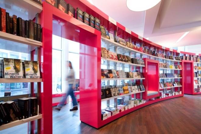 整个书店的设计以红色调为主,蓝色的灯光衬托下,处处透着朝气,像是遨游在书的海洋中。