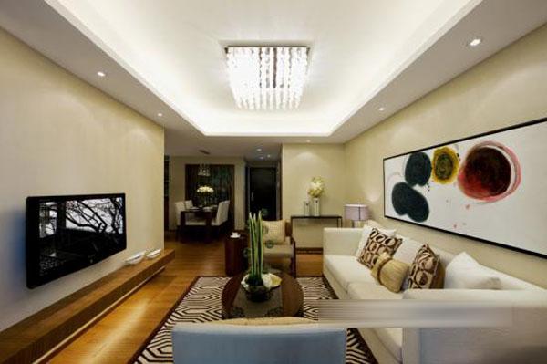 客厅围绕实用居住为主题设计得简约、素雅而又不失品质,浅米色作为主基调粉饰墙面,搭配色彩浓重的装饰画强化了空间的层次感与感染力,偶尔渗入的紫色台灯、绿色盆景,跳跃着生动的气息。布艺沙发更是令人易于亲近,深色的源自中式吉祥符号的原创地毯,渲染了单调的笔触,在清新的格调中显得含蓄、幽雅。