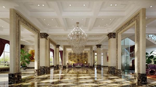 这是三星五金新办公楼的设计方案。对于很多人而言,古典的魅力就在于其特有的贵族气。客观而言,如果没有贵族气,古典就失去了存在的理由。大厅地面采用深色天然石材做为材料,带有雕刻的柱面底座与地面石材风格一致。