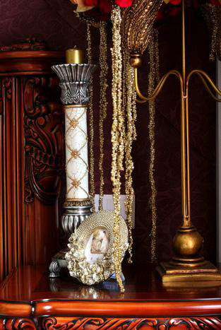 客厅挑高7米,半弧挑台是后加的,客厅TV墙设计了超高的大理石装饰性壁炉,上面特别订制了一幅砂岩浮雕“圣经”故事作品,替代了一般的挂画,颇为气势。门廊设计4根罗马柱,吊顶做穹顶处理,餐厅实木吊顶,铺设进口莎安娜大理石拼花地面,三面全景落地窗,配以高档欧式家俱,效果华贵气派,营造出一派典雅高贵的欧陆风情。