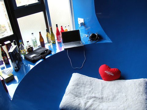 餐厅地板不规则地倾斜着,厨房是下陷的,书房则布以凹陷的地板。电源开关被安置在意想不到的地方,你要摸索着去感觉正确的位置才行。 通向阳台的玻璃门太小了,人只能弯着腰爬过去。在这里还经常失去平衡,找到平衡后,不知什么时候又会被绊到、跌倒。这里没有橱柜空间;居住者要自己找到生存下去的方法。