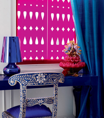 窗户装饰板的图案来自莫卧儿王朝宫殿的彩色琉璃,不过这里材料是塑胶。粉色装饰板在保证私密的同时也带来合适的亮度。亮粉与蓝的搭配跳跃而热烈。